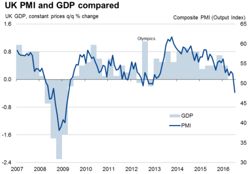 Согласно последним данным от Markit Economics, активность в частном секторе Великобритании сократилась в июле самыми сильными темпами с начала 2009 года. Композитный индекс PMI упал до 47,7 пункта против 52,4 пункта в июне. Тем временем, индекс PMI в секторе услуг снизился до 47,4 пункта с 52,3 пункта, достигнув 88-месячного минимума. Производственный индекс PMI достиг 49,1 по сравнению с 52,1 в июне. Последнее значение оказалось минимальным за 41 месяц.