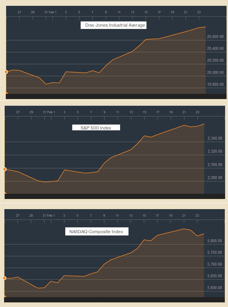 Кроме того, президент США пообещал пересмотреть налоговую политику, заявив при этом, что в ближайшее время будет представлен «феноменальный налоговый план». Впрочем, он не озвучил какие-либо детали. Официальный представитель Белого дома сообщил, что налоговый план будет всеобъемлющим и коснется не только компаний, но и частных лиц. Между тем, Трамп пообещал топ-менеджерам перевозчиков ослабление госрегулирования и модернизацию инфраструктуры, подчеркнув, что все эти меры помогут их компаниям нанять больше сотрудников. Учитывая такие заявления, инвесторы стремились покупать акции компаний США и продавать гособлигации ввиду перспектив снижения налогов, уменьшения регуляторной нагрузки и роста прибыли. В итоге, с начала февраля основные фондовые индексы США зафиксировали повышение на 4,0%-4,9%.