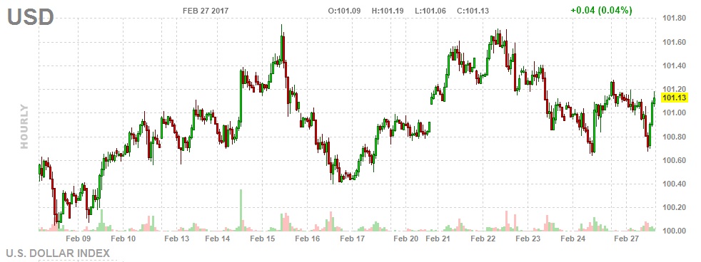 Вскоре свою точку зрения по поводу перспектив денежно-кредитной политики озвучили другие представители ФРС. Президент ФРБ Филадельфии Харкер просигнализировал, что на мартовском заседании, видимо, поддержит повышение ставок, если будут дополнительные признаки того, что инфляция набирает импульс. Также он заявил, что считает целесообразным повышение процентных ставок в 2017 году три раза ввиду улучшения экономической ситуации. Тем временем, президент ФРБ Кливленда Местер сообщила, что если текущая экономическая ситуация в США сохранится, то она выступит за повышение ставки в скором времени. Кроме того, протокол последней встречи ФРС, опубликованный на прошлой неделе, также сигнализировал о "довольно скорой" возможности повышения ставок ввиду улучшения ситуации в экономике. Некоторые из членов FOMC сообщили о более высокой вероятности повышения ставок в том случае, если инфляция резко вырастет, а уровень безработицы сильно сократится. Все эти комментарии укрепили мнение участников рынка, что ставка может быть повышена уже в следующем месяце. Согласно рынку фьючерсов, сейчас вероятность повышения ставки ФРС на мартовском заседании составляет около 35%. Вместе с тем, усиление ожиданий по поводу повышения процентных ставок ФРС оказало поддержку американской валюте. С начала февраля индекс доллара США, показывающий отношение доллара к корзине из шести основных валют, вырос примерно на 1,7%.